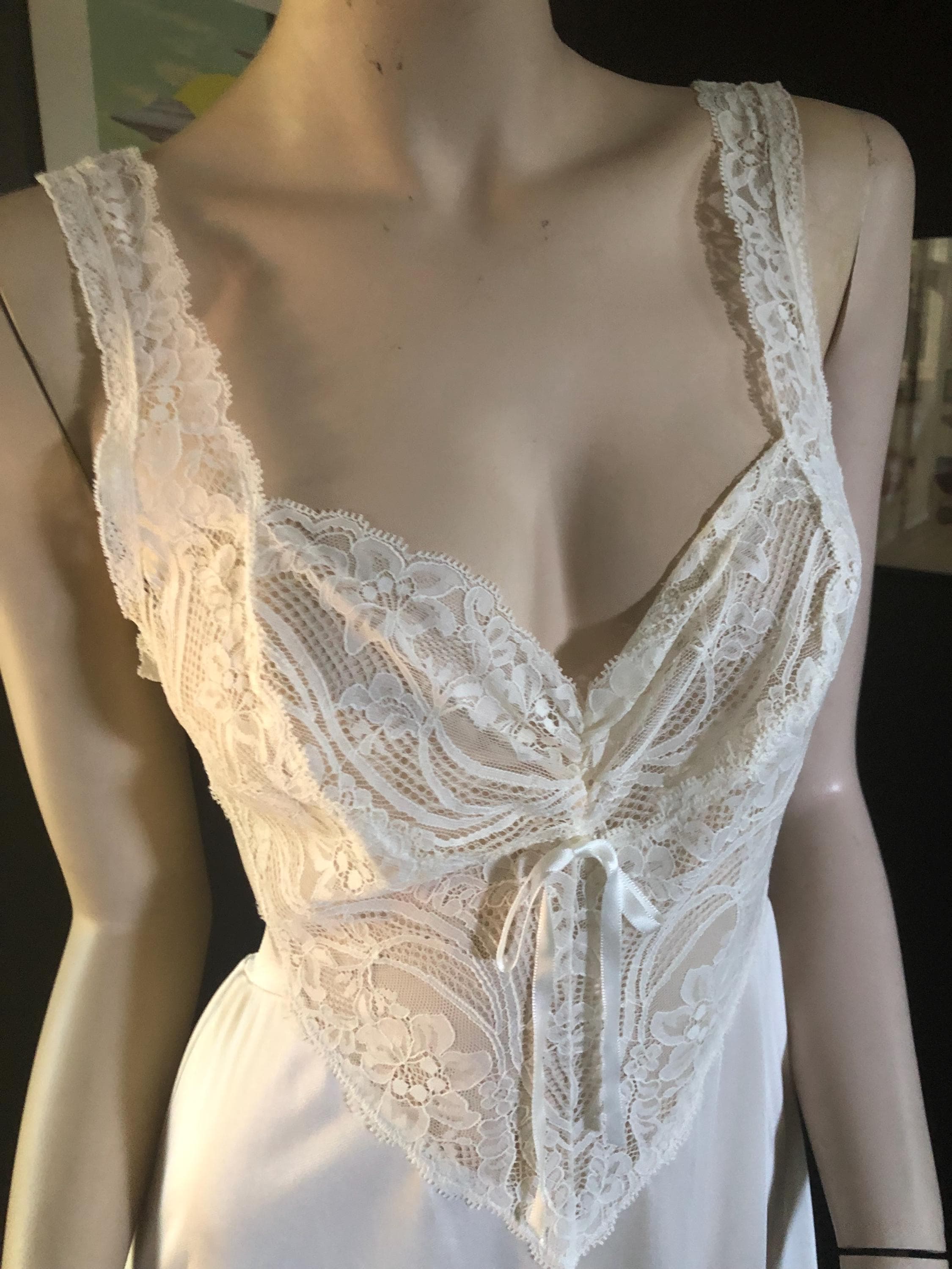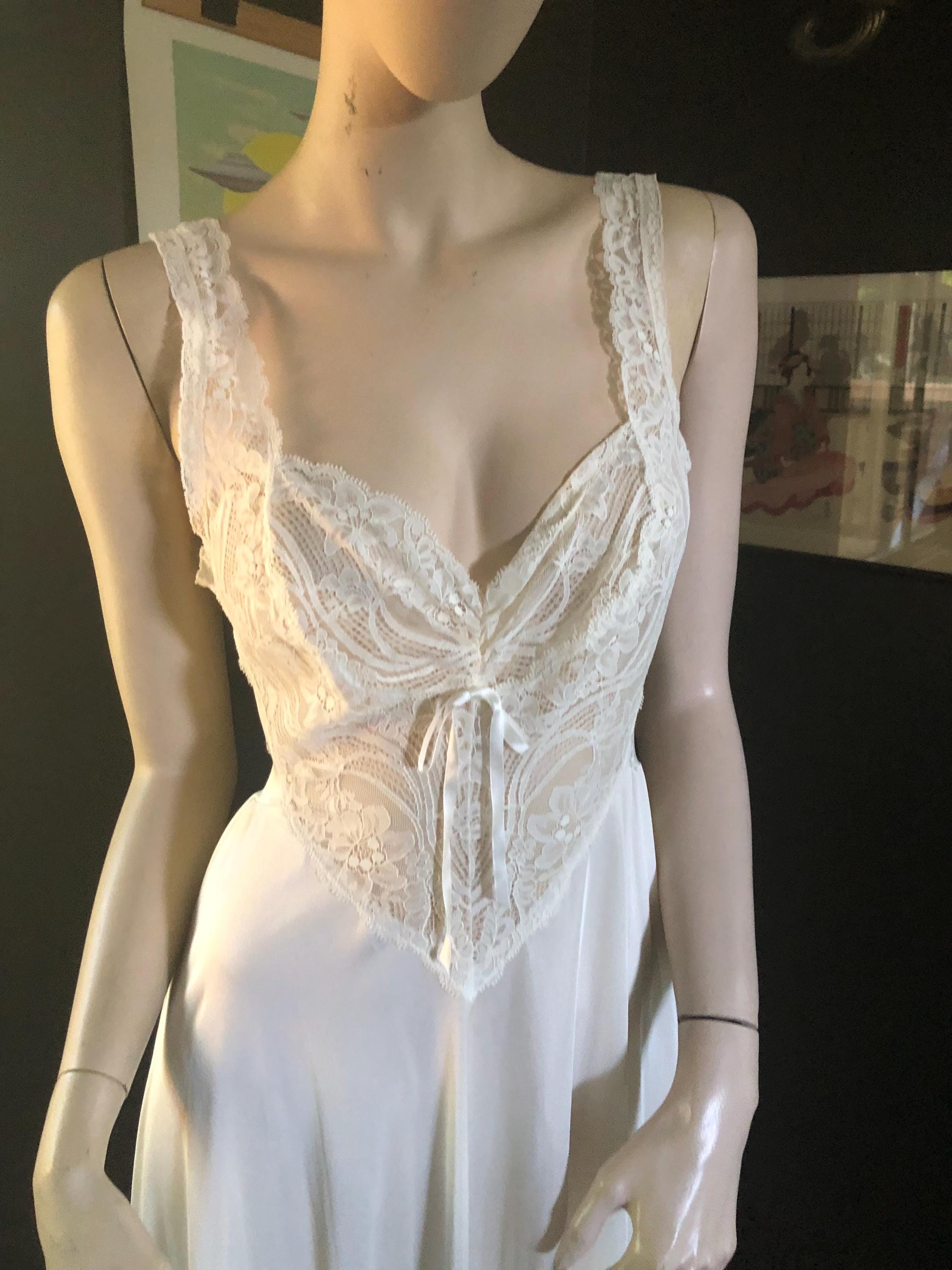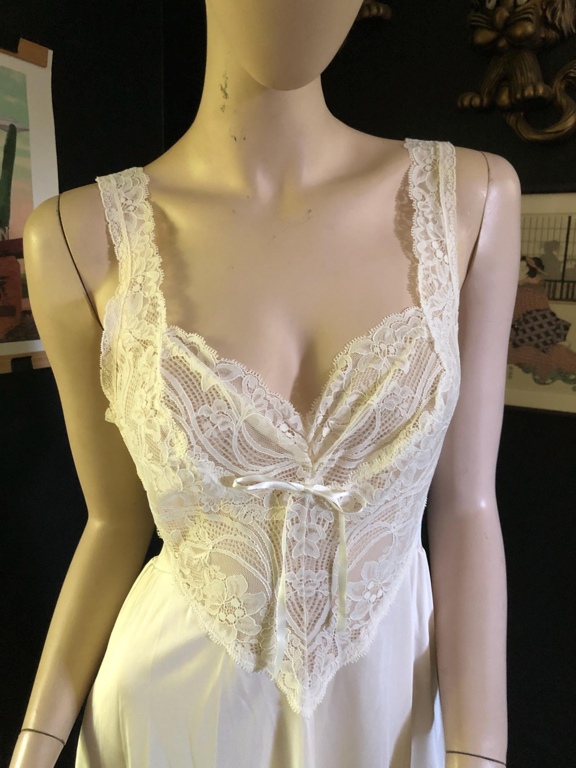 Cream colored spandex Olga Nightgown in excellent condition. Front is a sheer lace v neck with a bow in the center. Straps are sheer. Sheer back is a deep v as well. The hem is loose