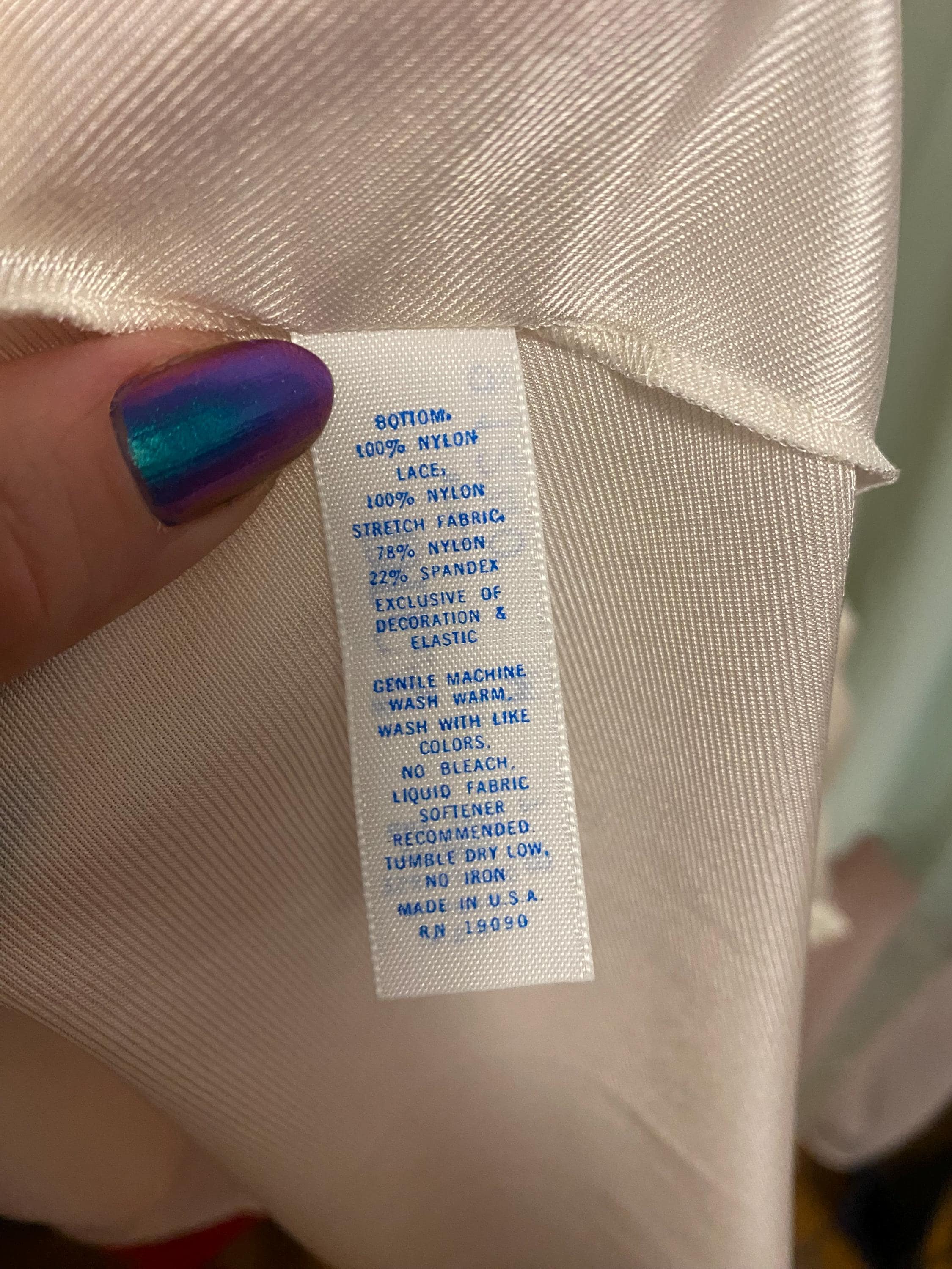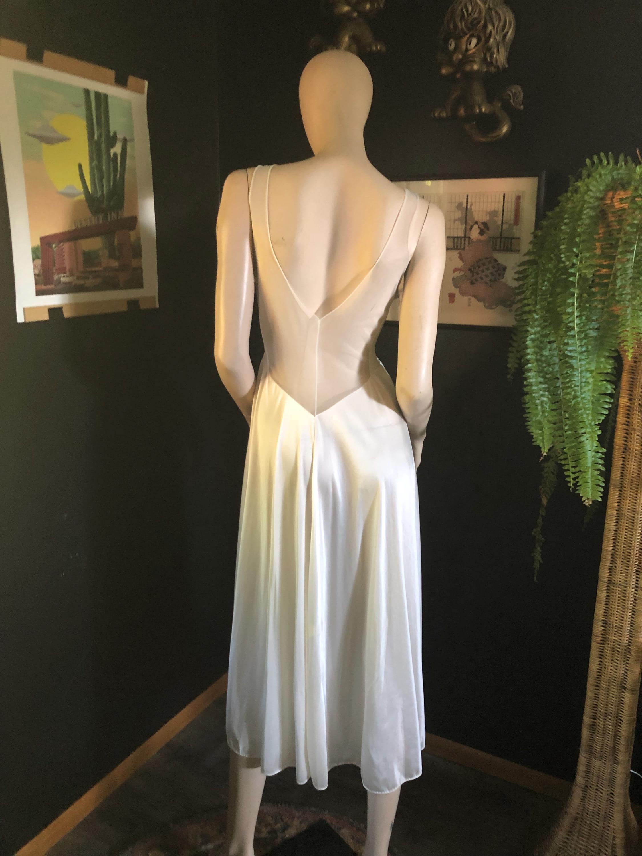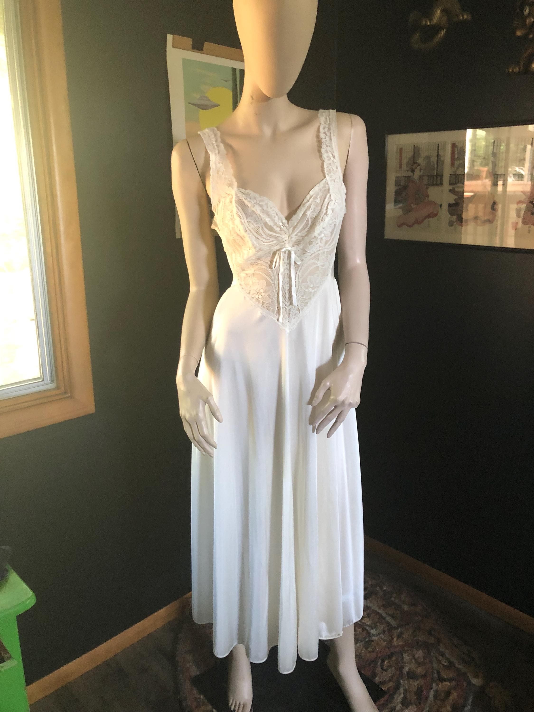 Cream colored spandex Olga Nightgown in excellent condition. Front is a sheer lace v neck with a bow in the center. Straps are sheer. Sheer back is a deep v as well. The hem is loose