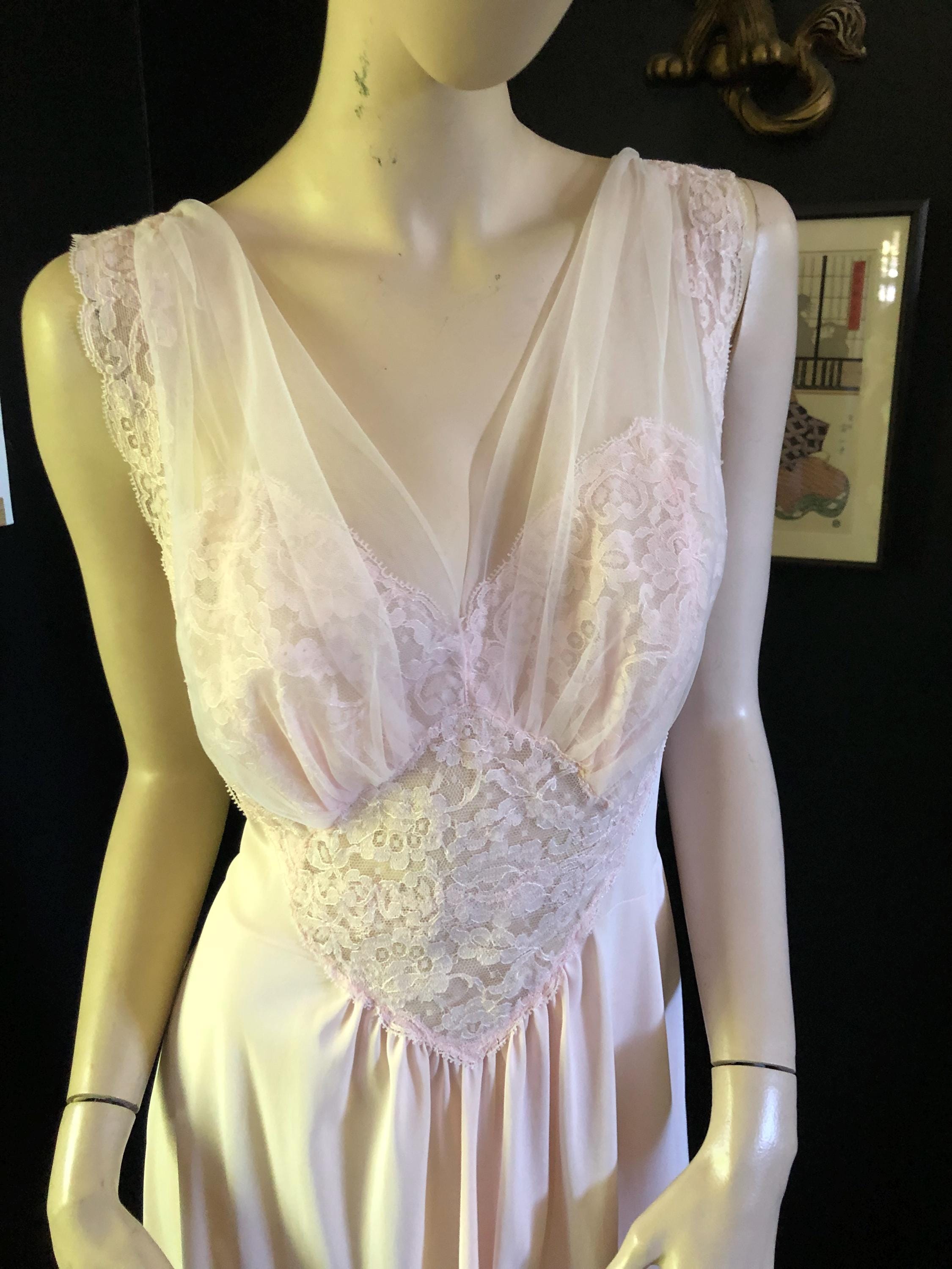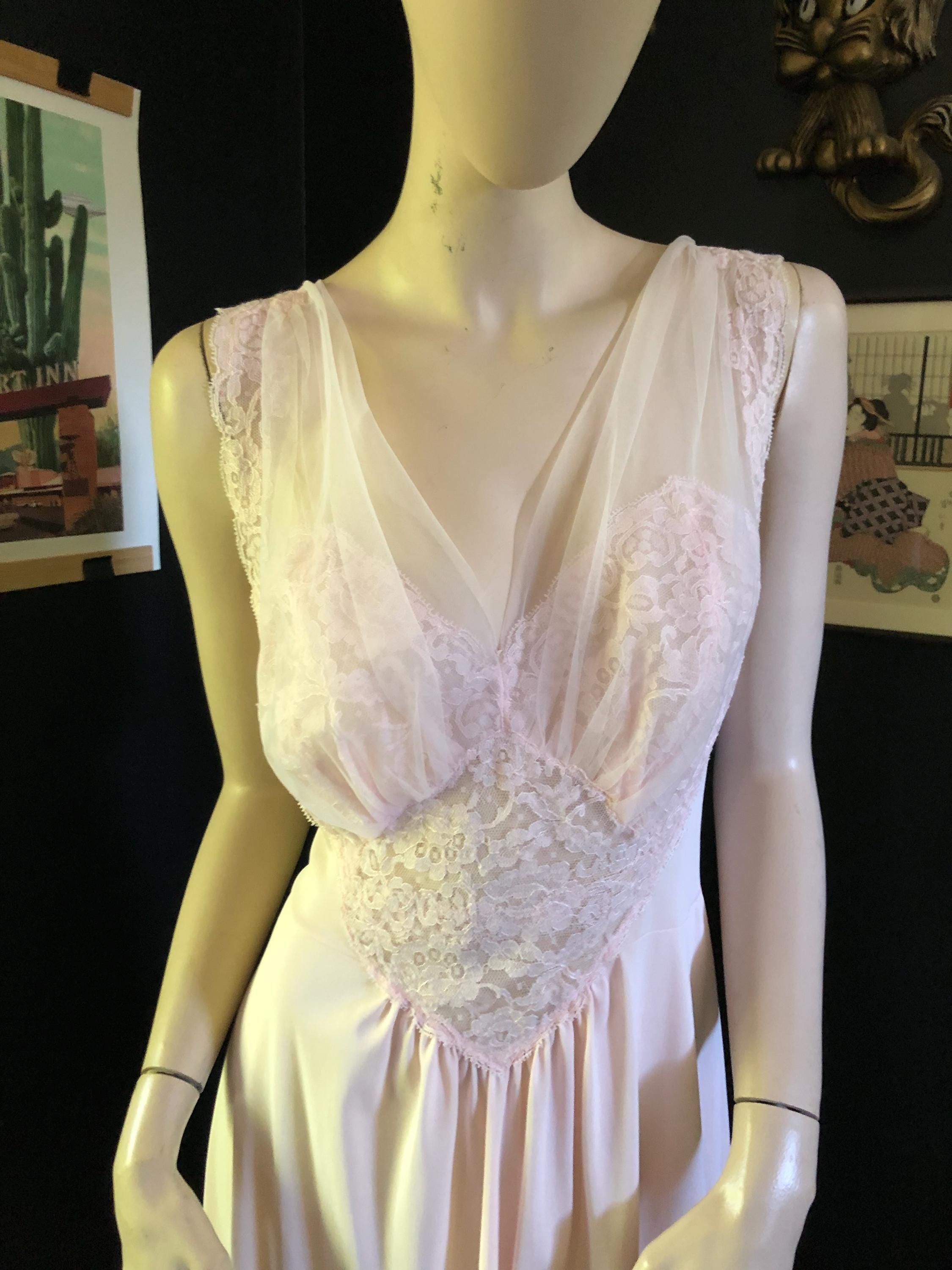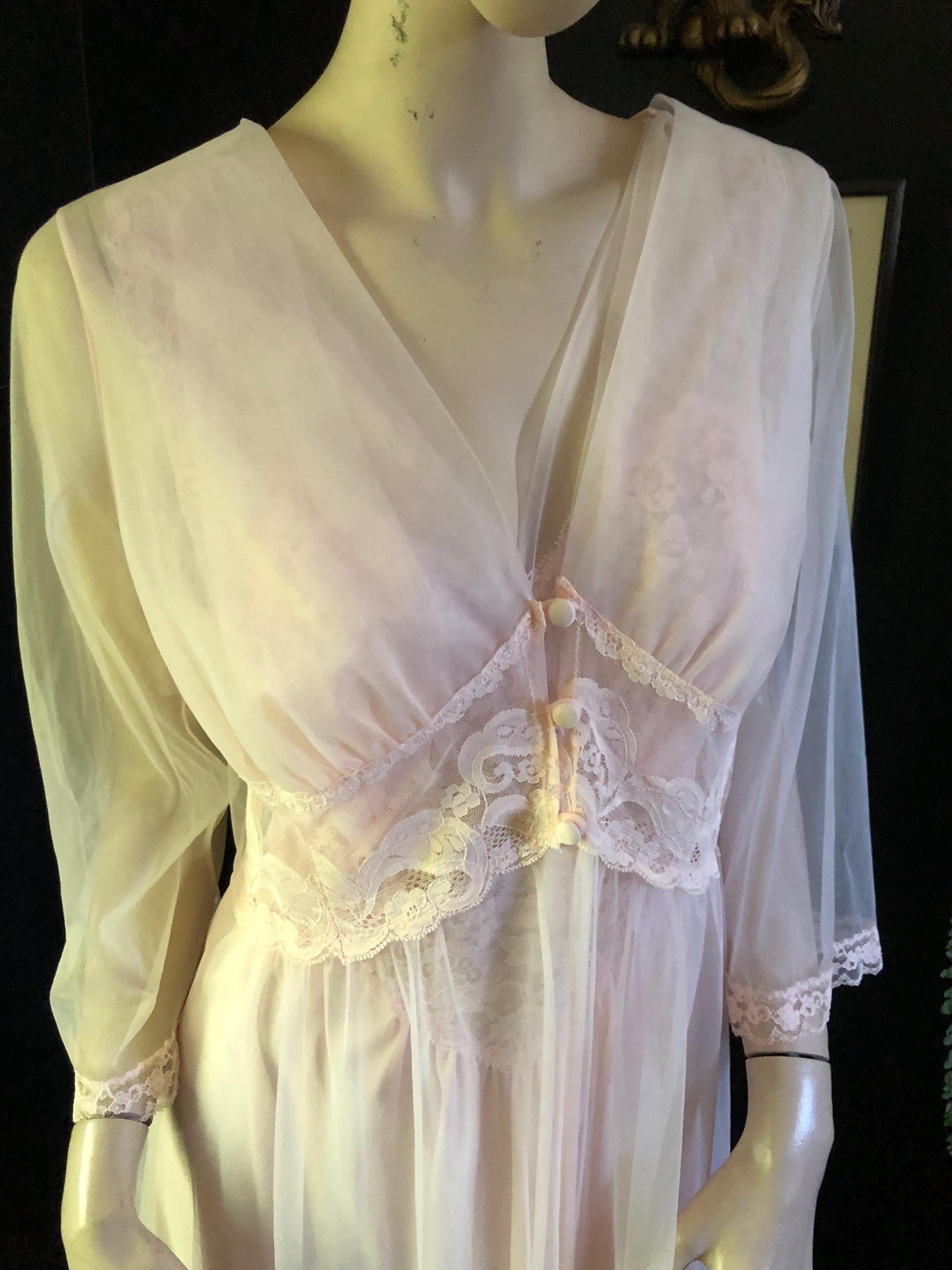 60's era nightgown and robe set. Nightgown looks like Olga but doesn't have a tag. Deep v neck lace neckline. Ankle length. Both pieces are in excellent condition. Size large. Garment has some stretch. 100% nylon.