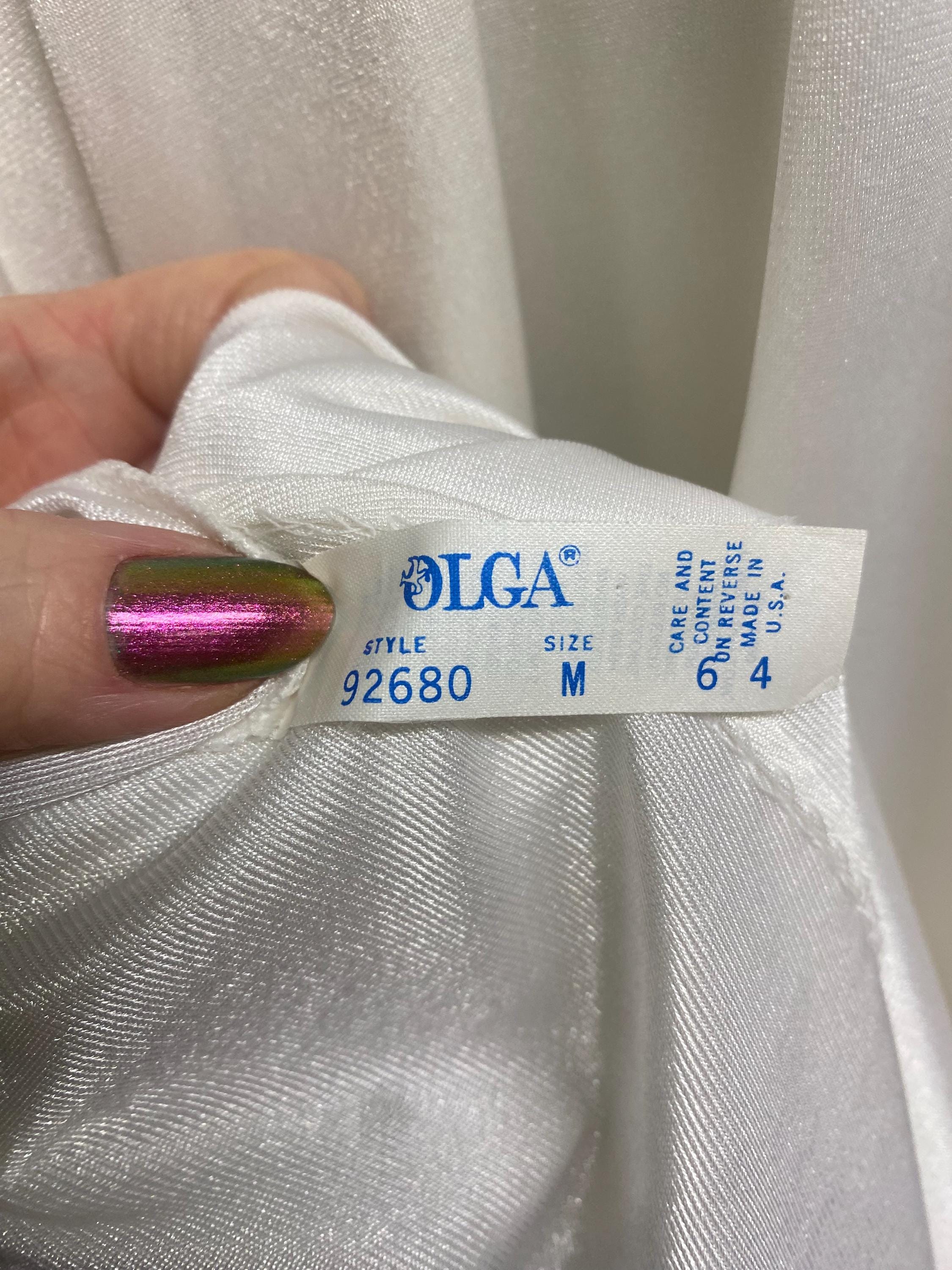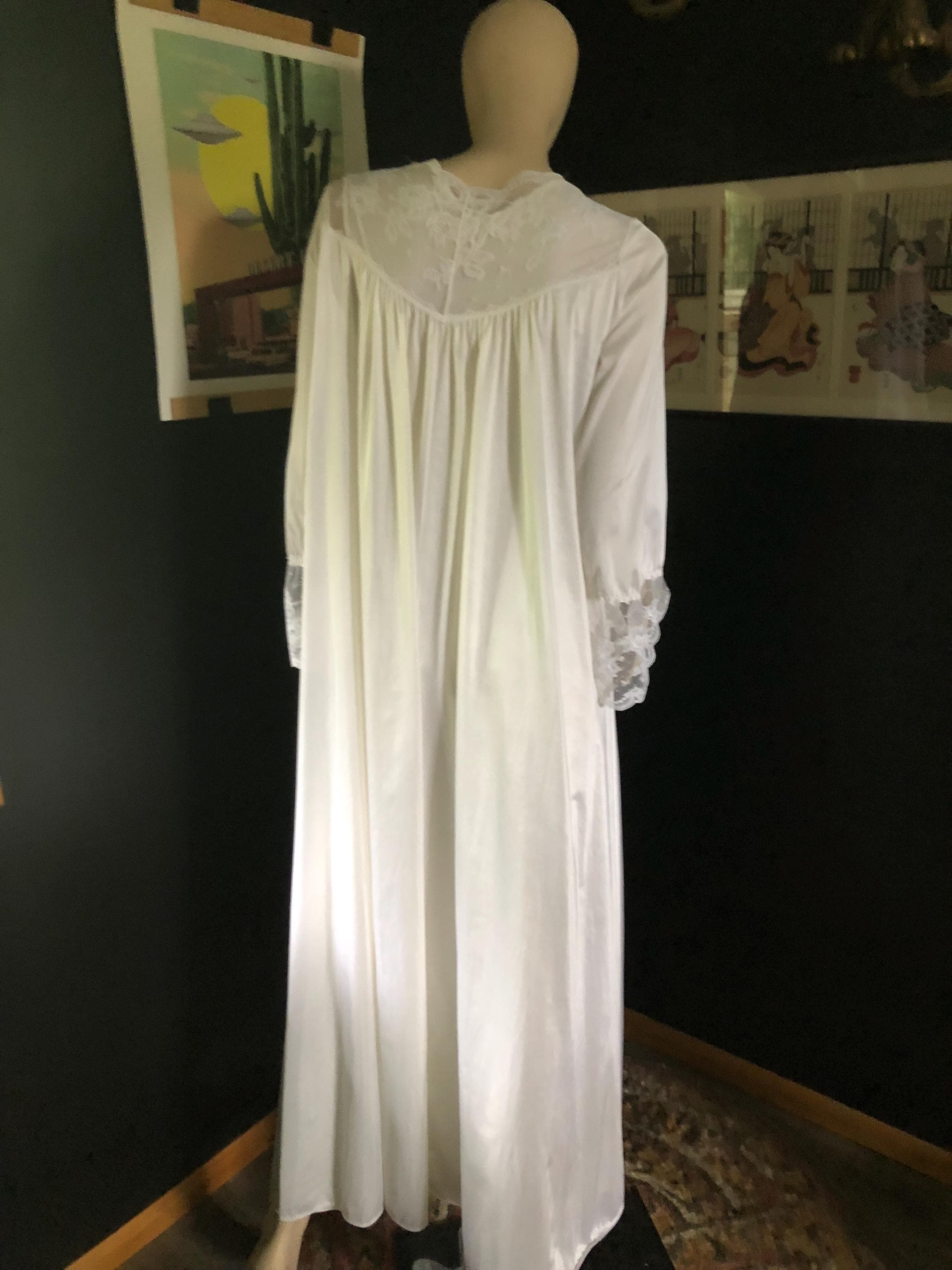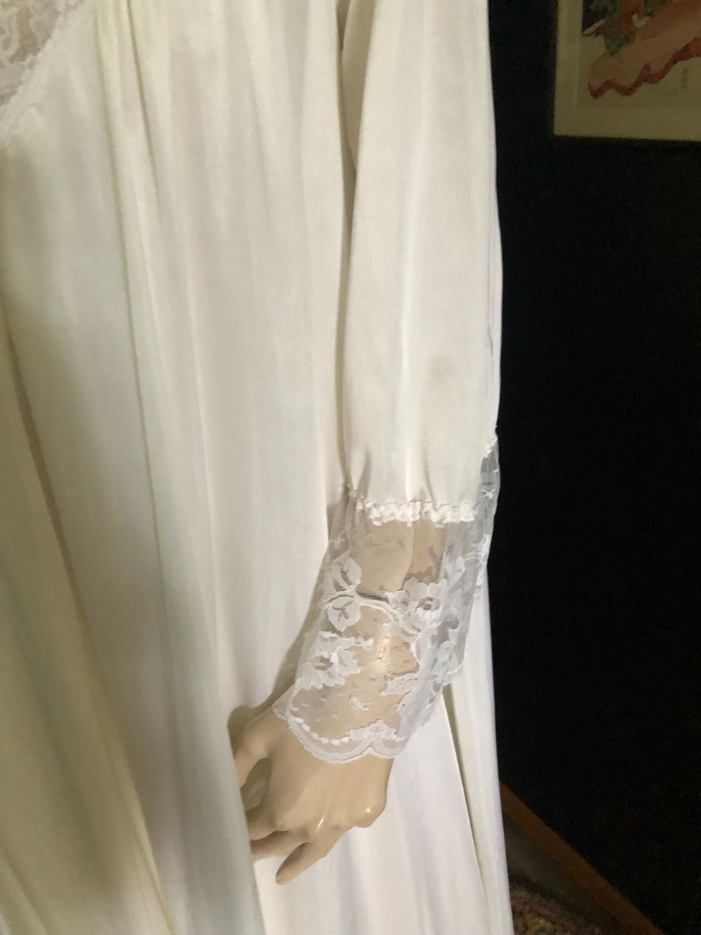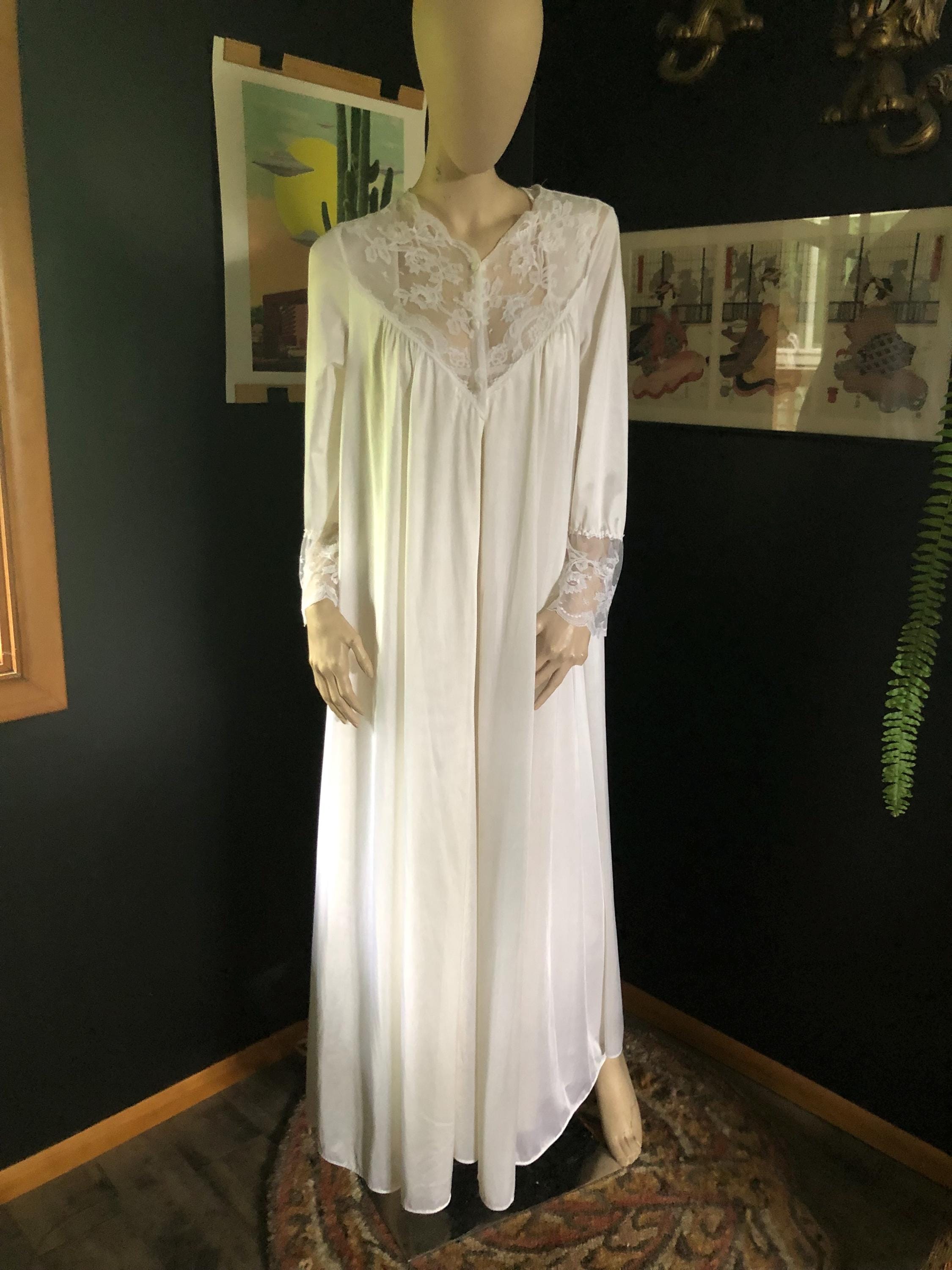 Amazing Vintage Olga nightgown and robe set. Size M with some stretch to the garment. Nylon/Spandex. Machine washable. Nightgown has lace v neck bodice with full swoop skirt. Robe is loose fitting with button closure and 3/4 length sleeves. Excellent condition. No stains or tears.