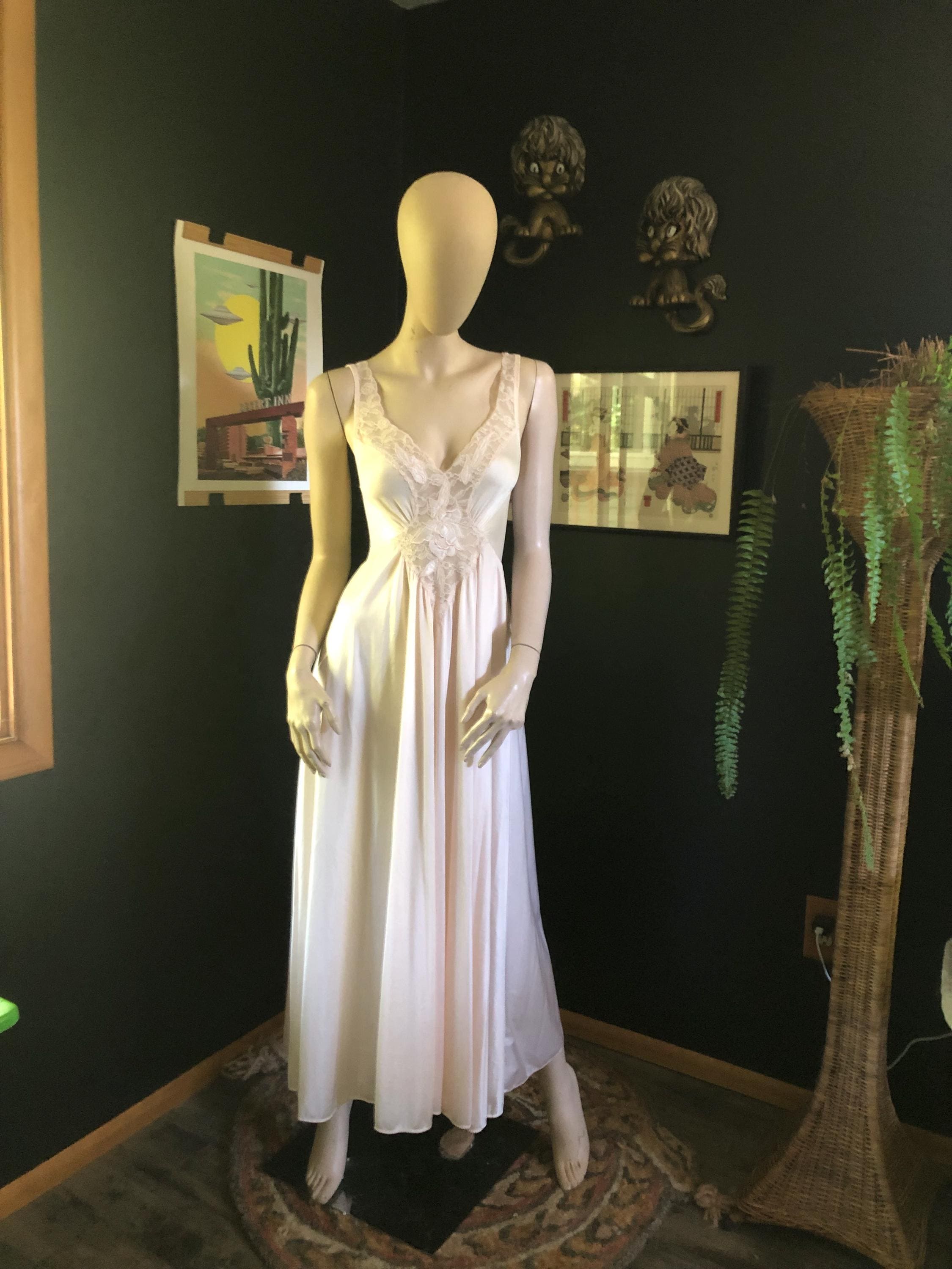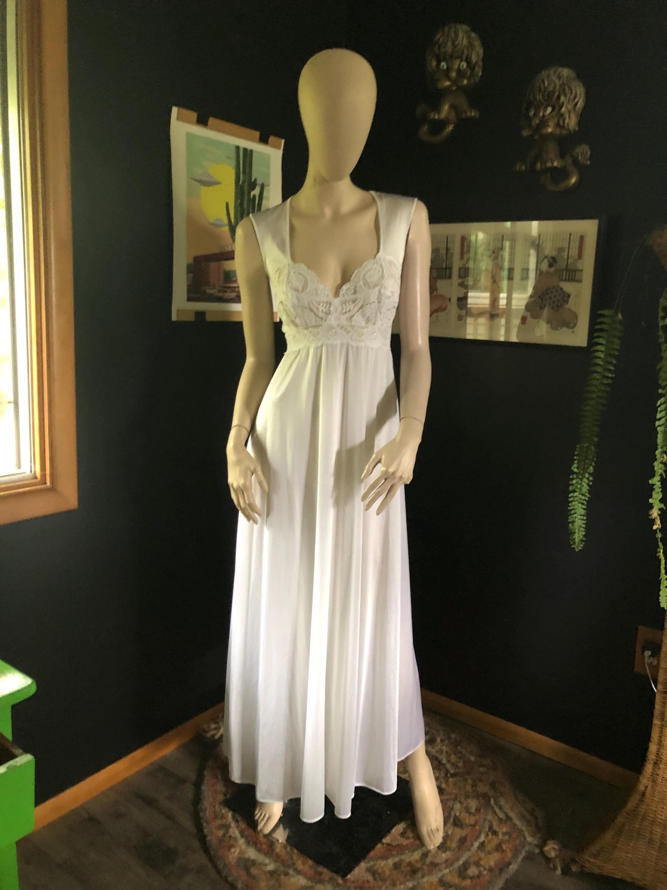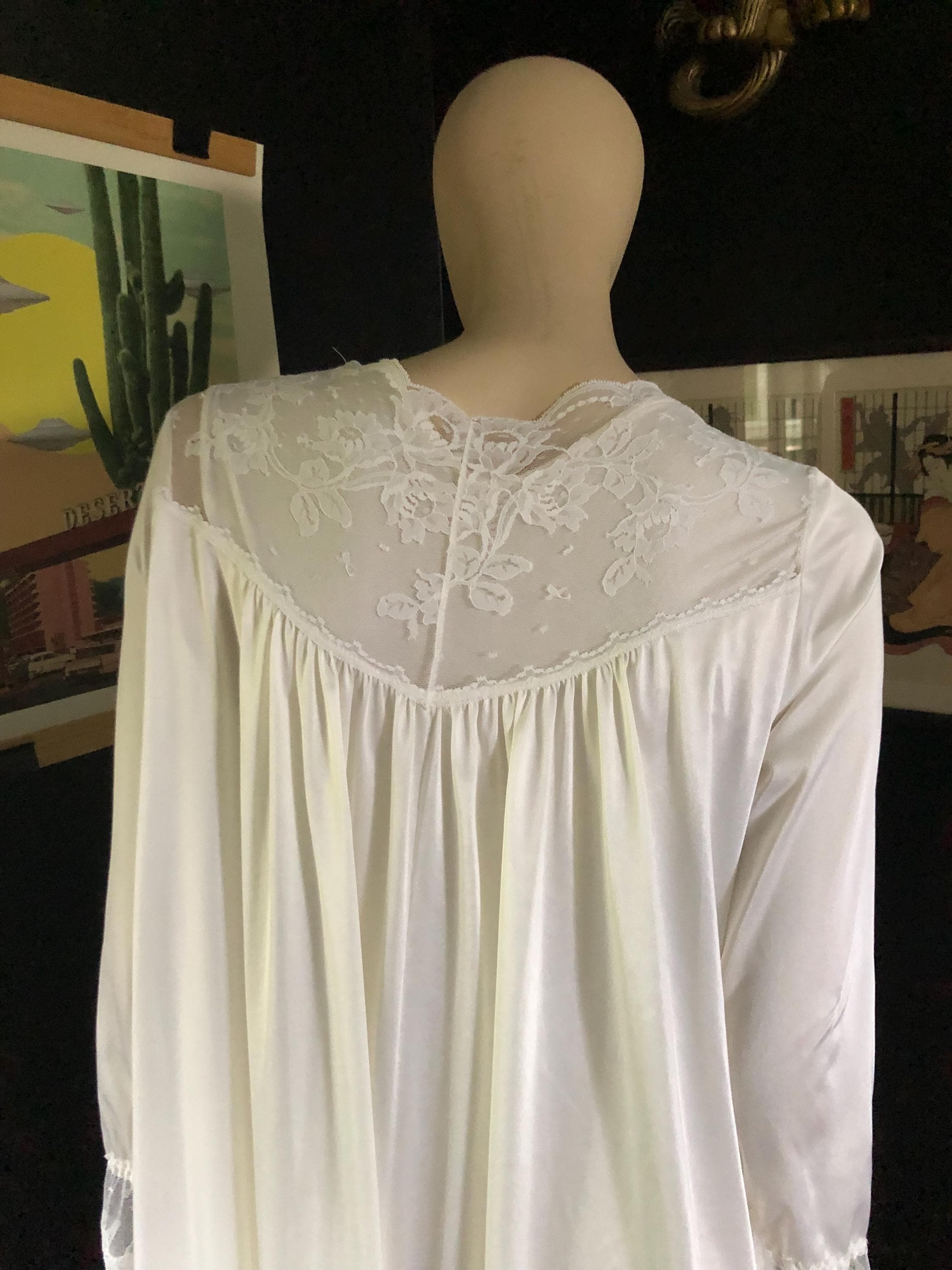 Amazing Vintage Olga nightgown and robe set. Size M with some stretch to the garment. Nylon/Spandex. Machine washable. Nightgown has lace v neck bodice with full swoop skirt. Robe is loose fitting with button closure and 3/4 length sleeves. Excellent condition. No stains or tears.