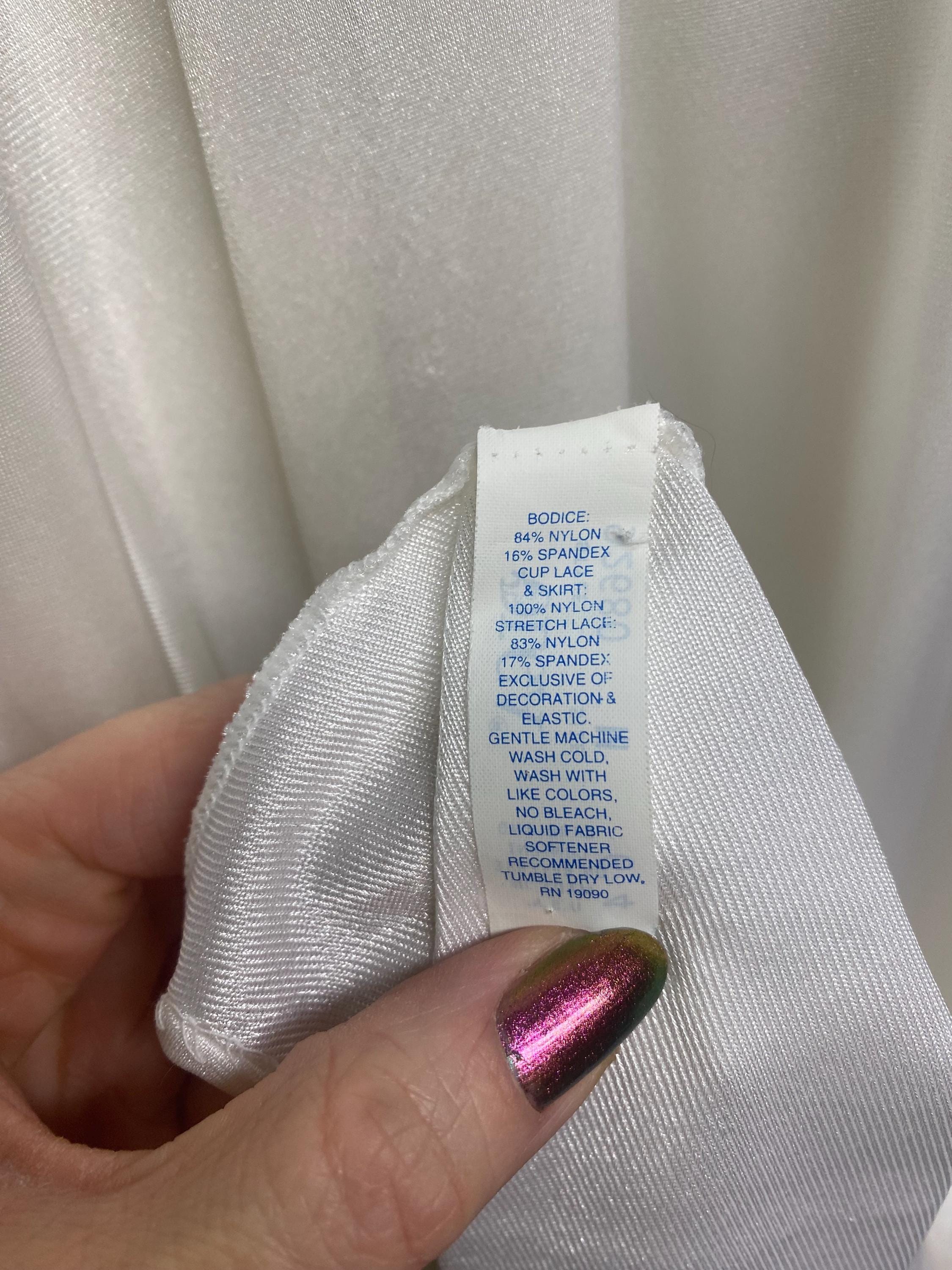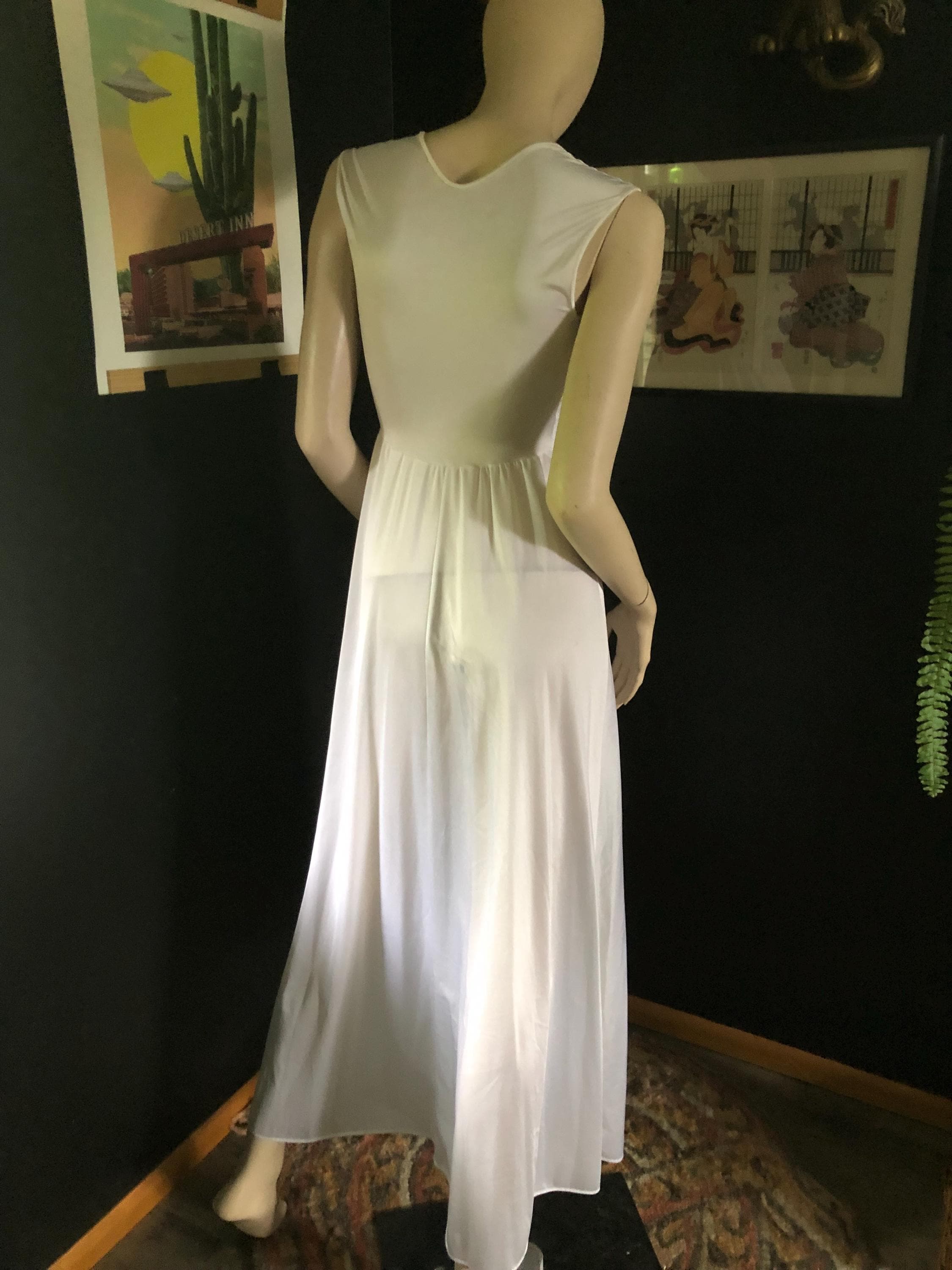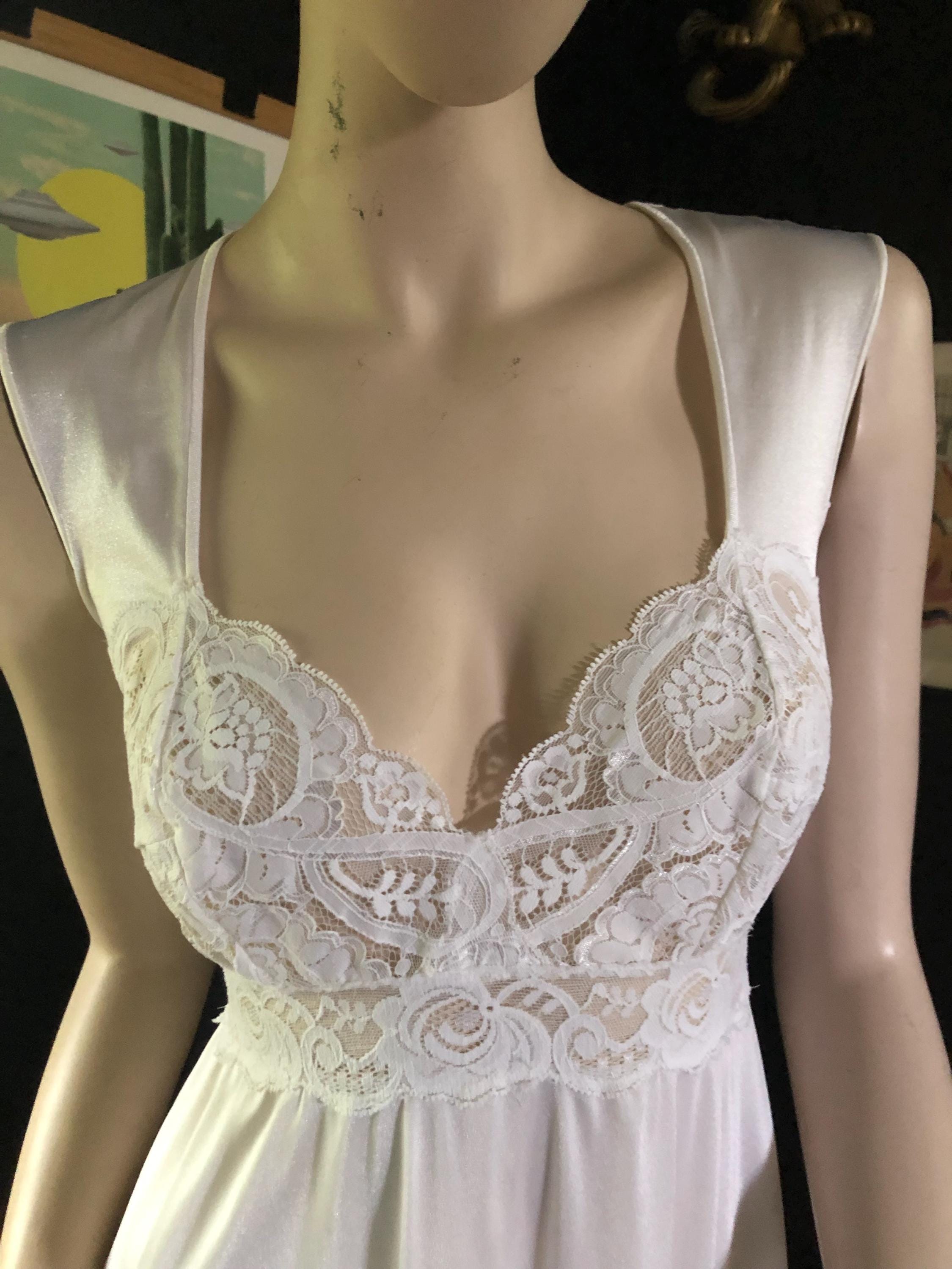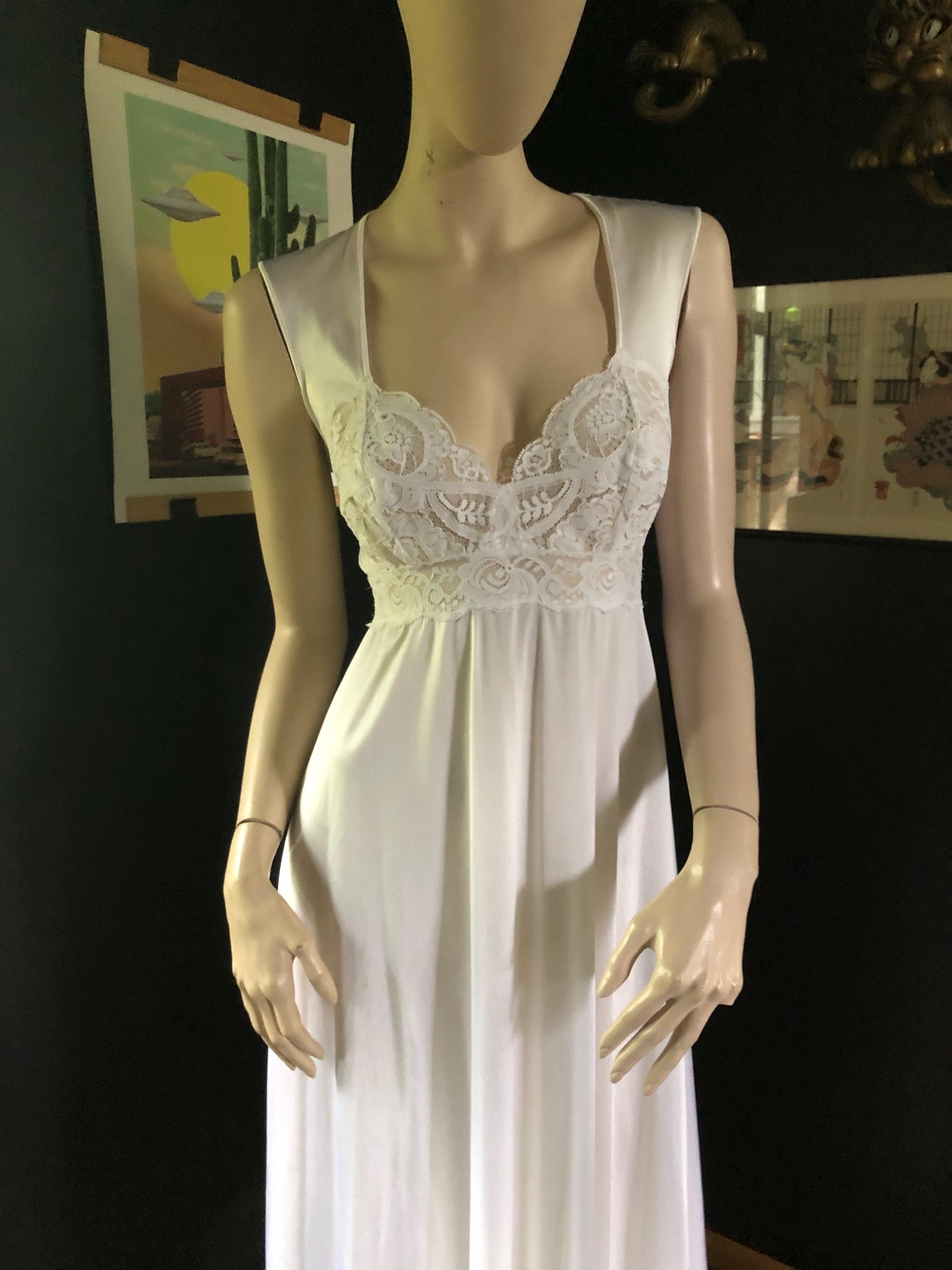 Amazing Vintage Olga nightgown and robe set. Size M with some stretch to the garment. Nylon/Spandex. Machine washable. Nightgown has lace v neck bodice with full swoop skirt. Robe is loose fitting with button closure and 3/4 length sleeves. Excellent condition. No stains or tears.
